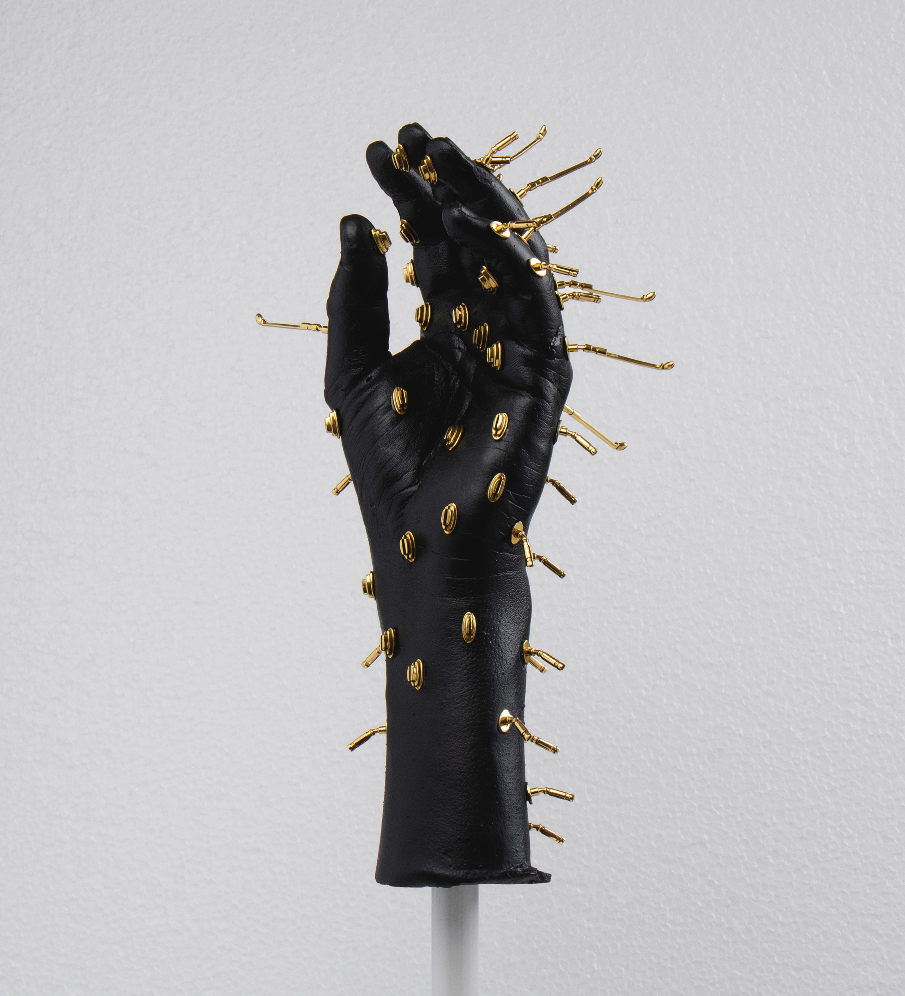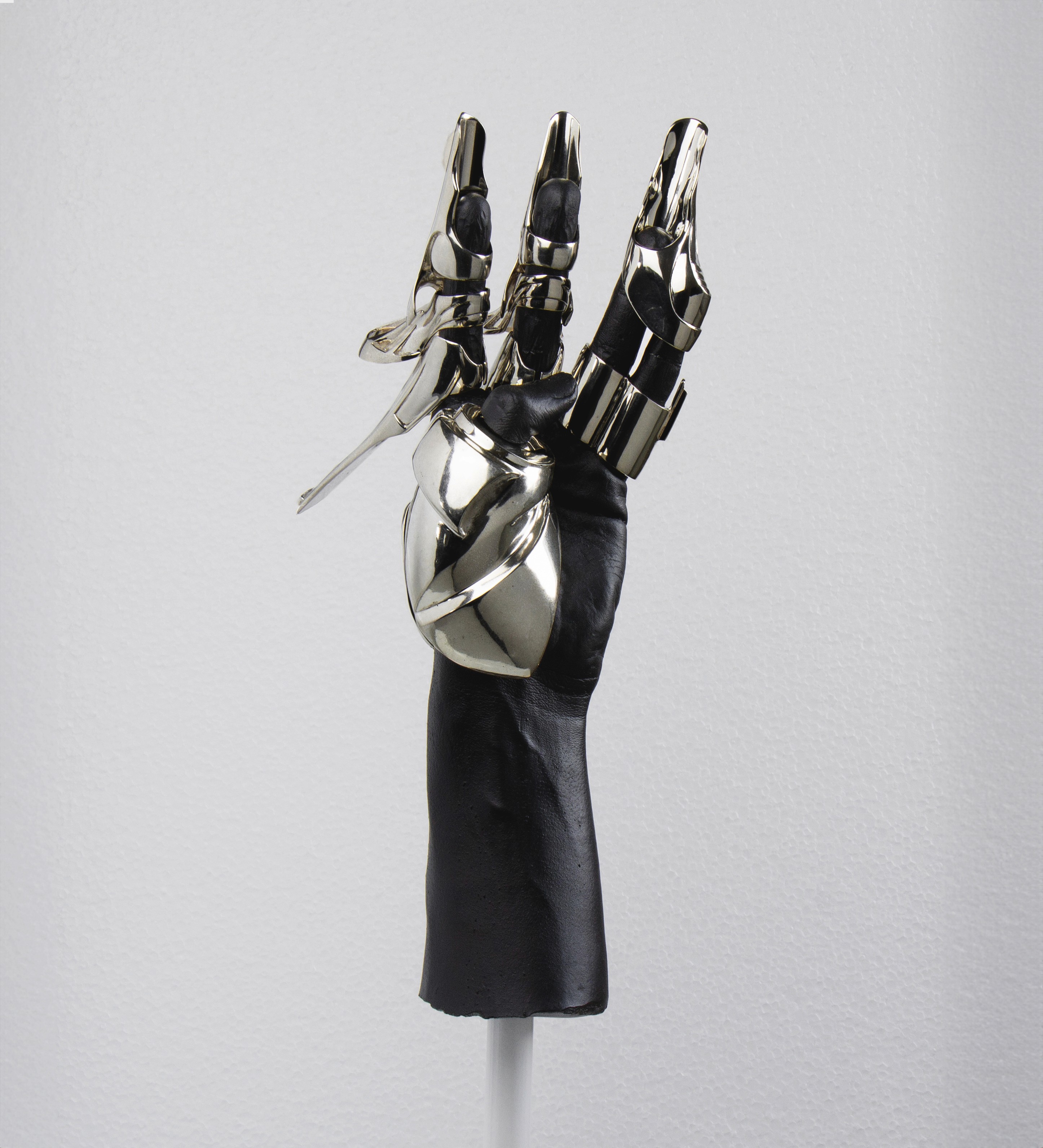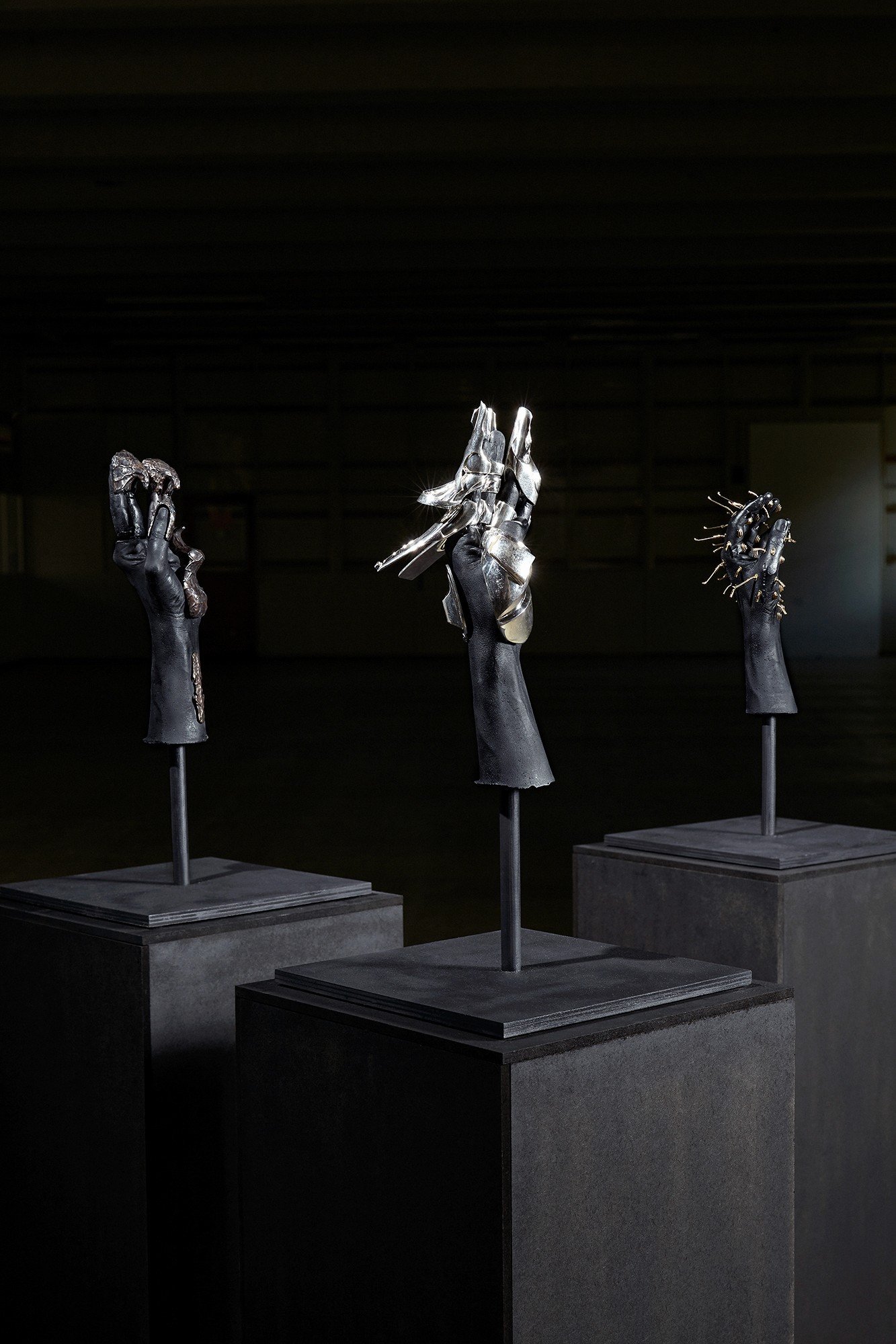 A series of three metal hand sculptures made from silver and brass,
