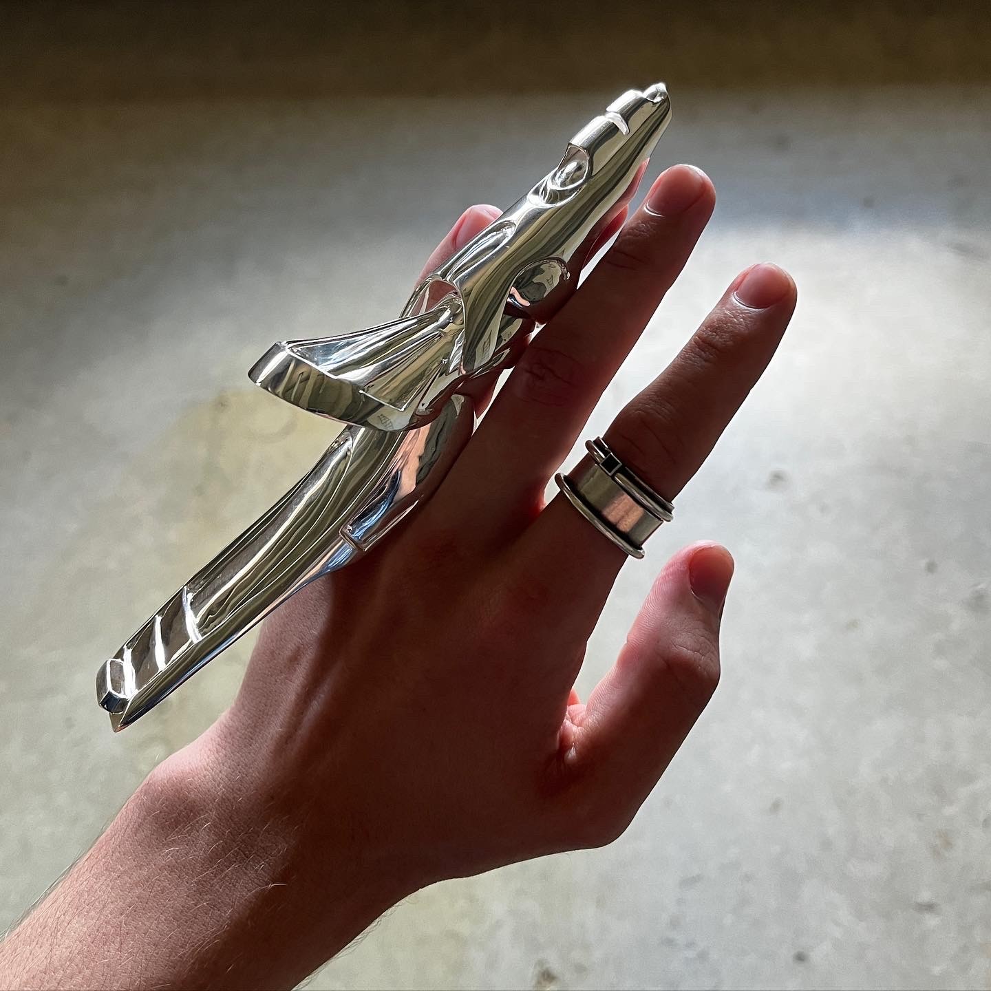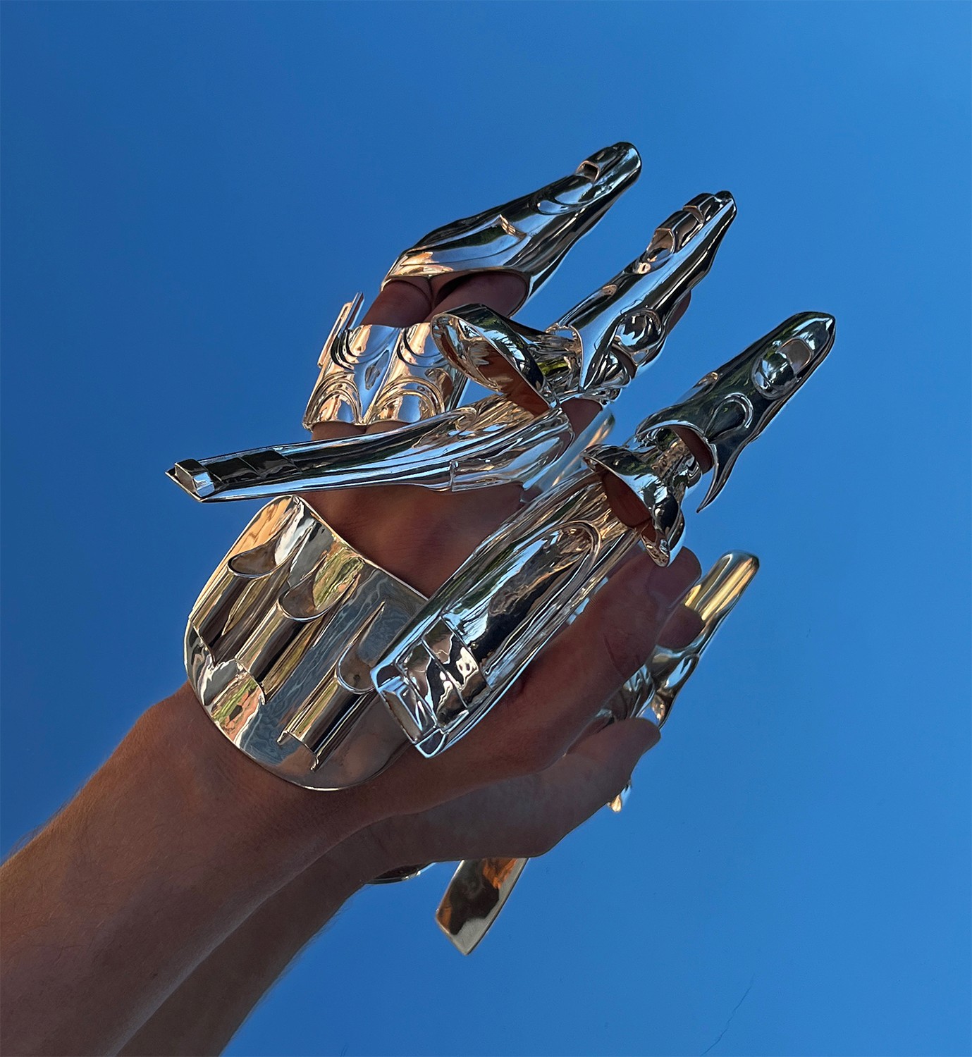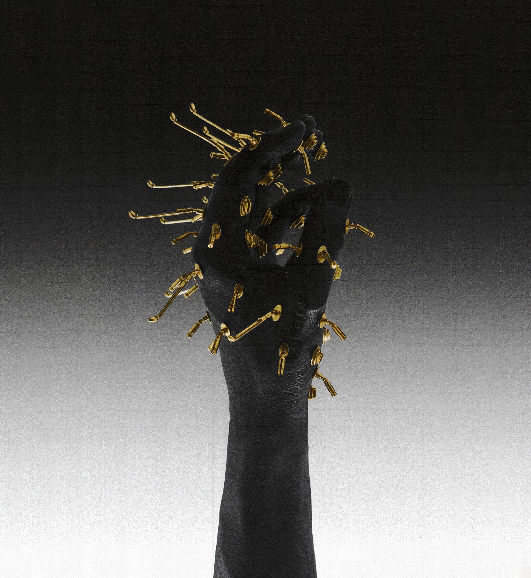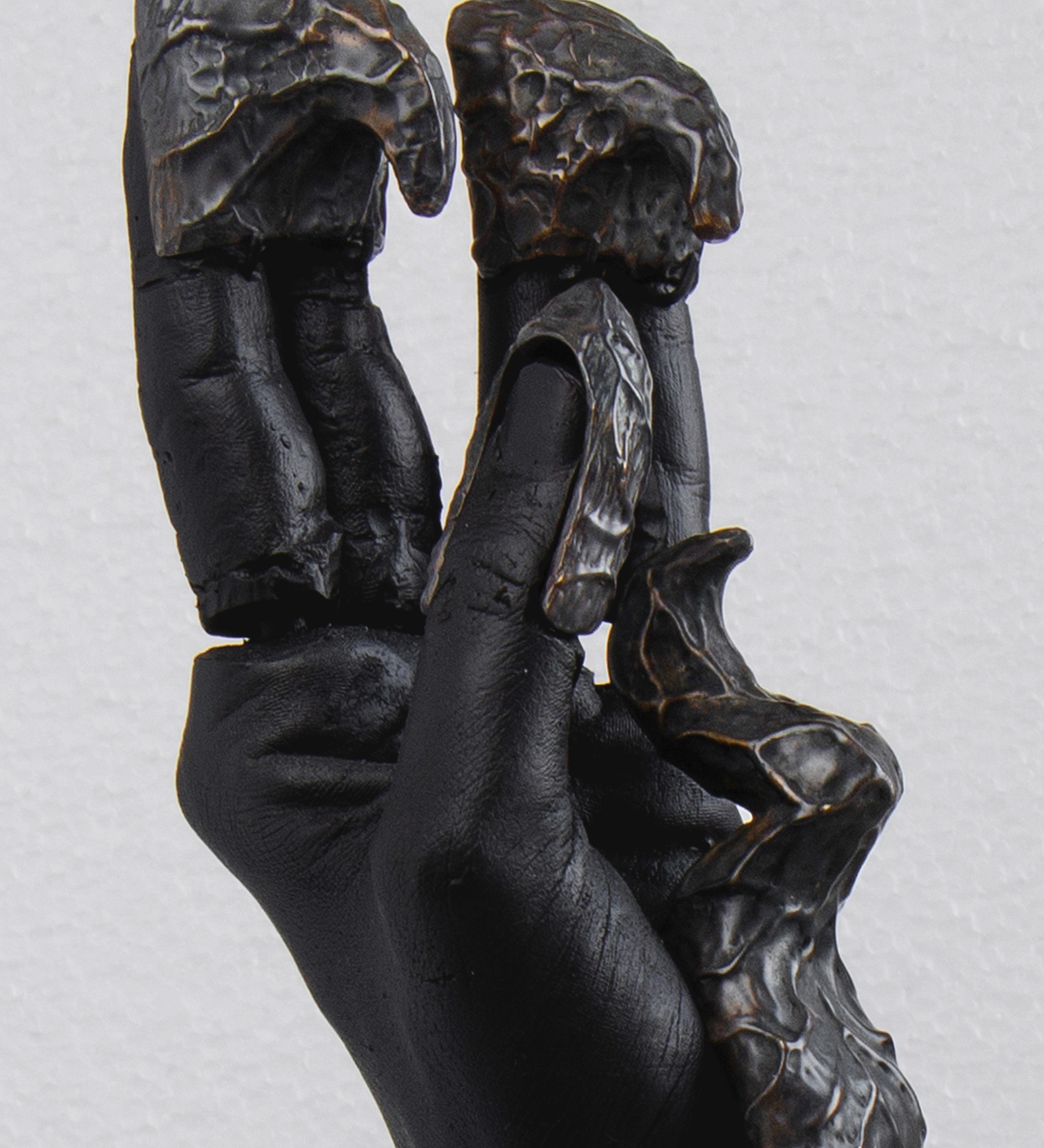 A series of three metal hand sculptures made from silver and brass,