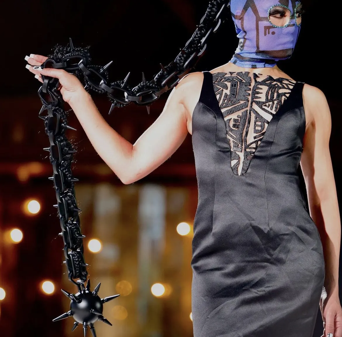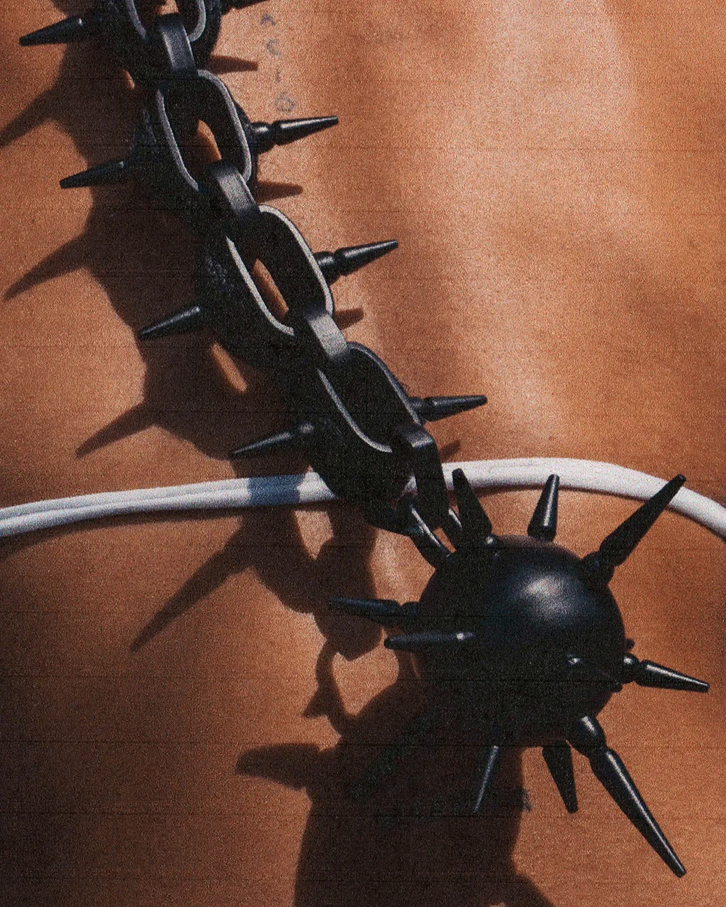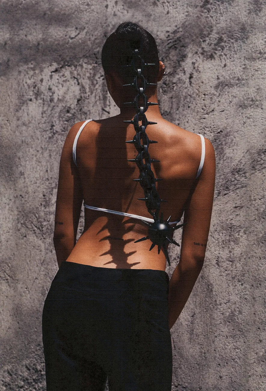 Hair accessory fusing organic braided hair with the rigidity of the medieval ‘Flail’ weapon.