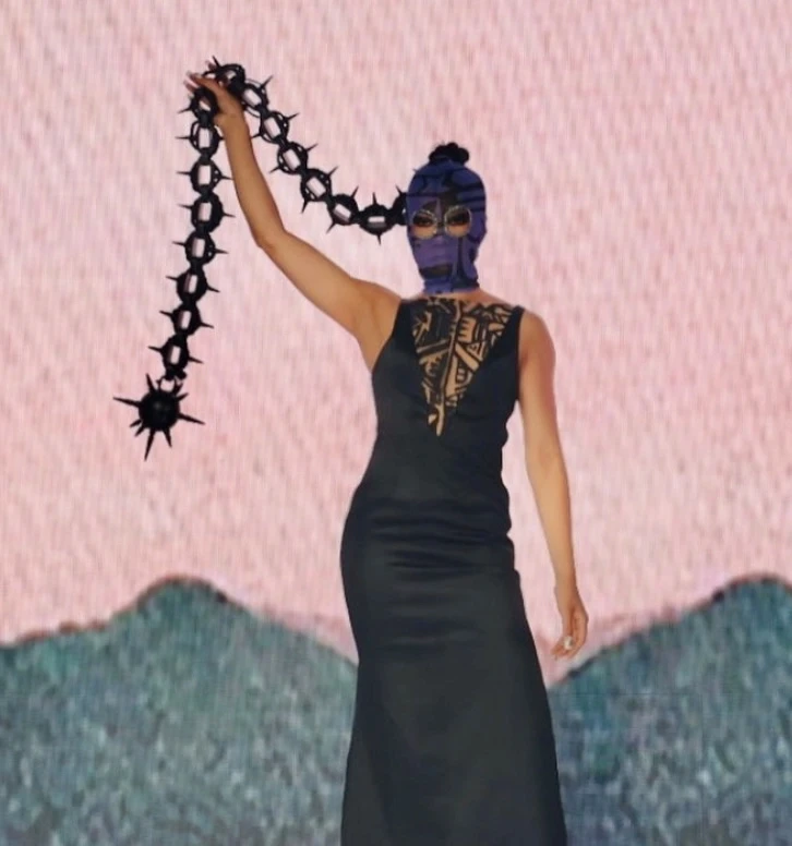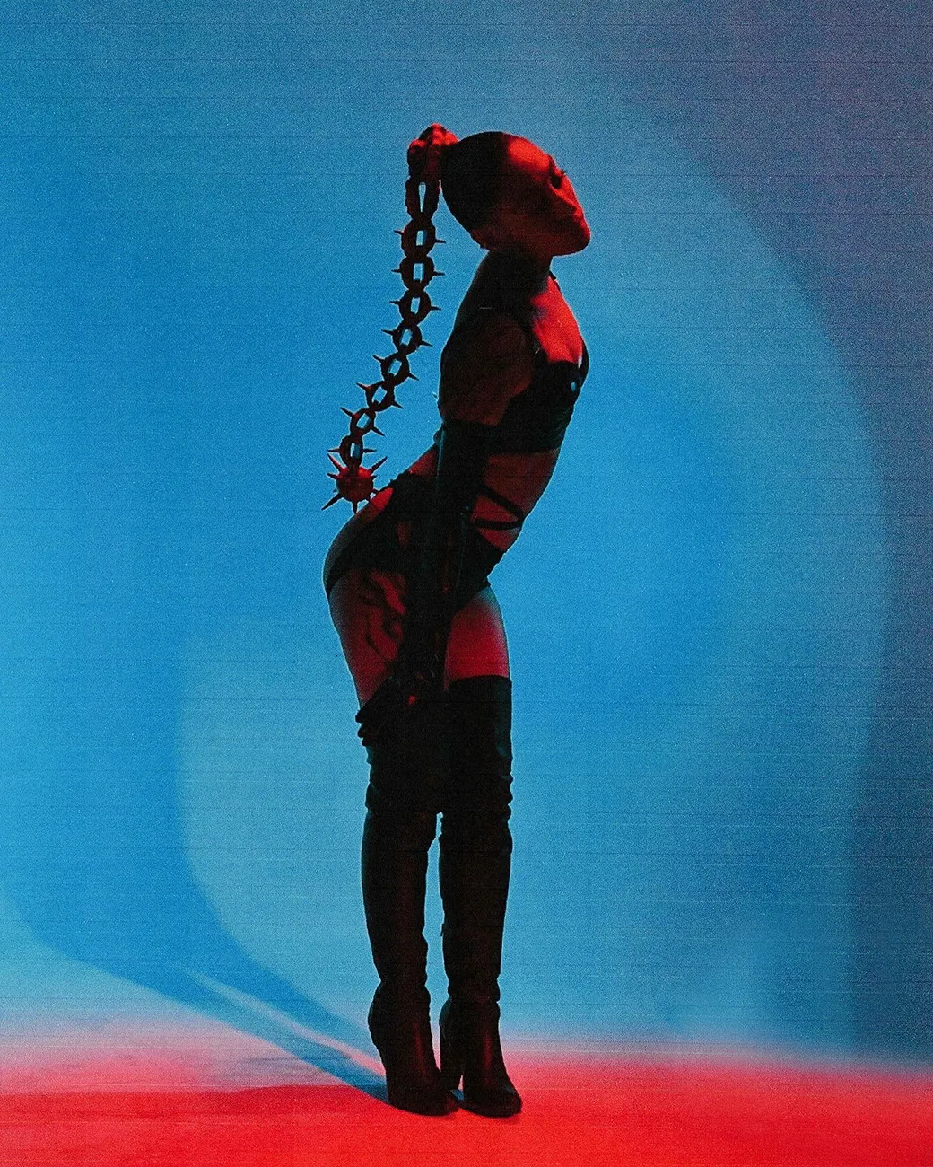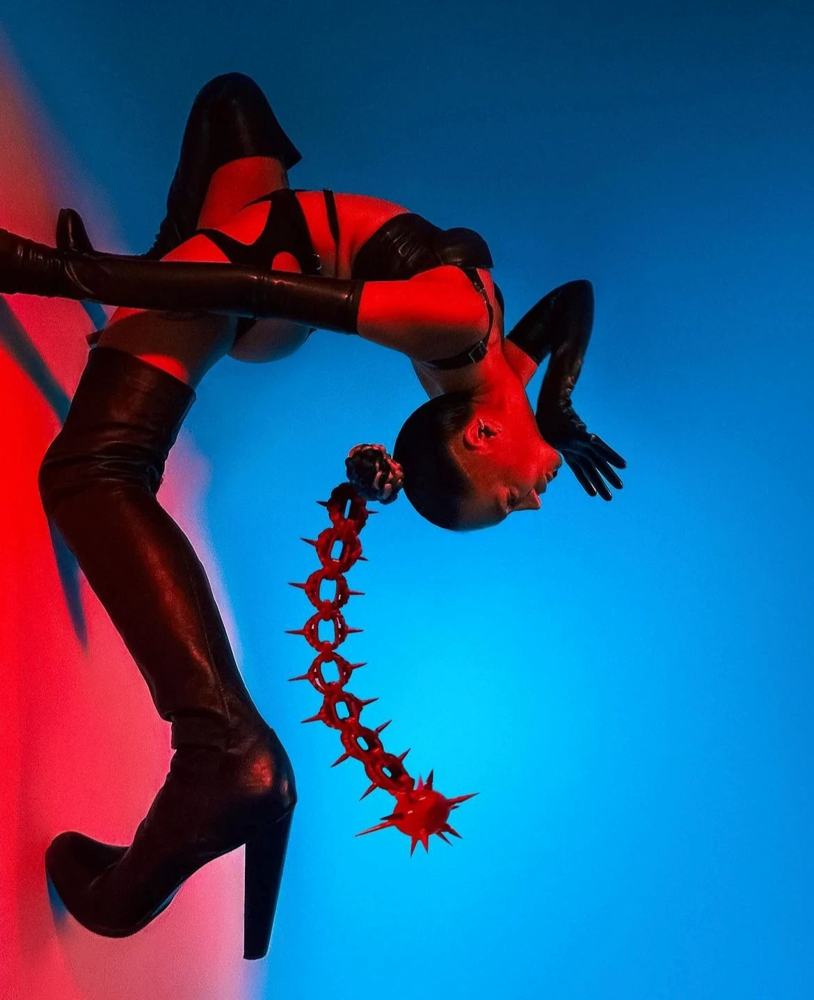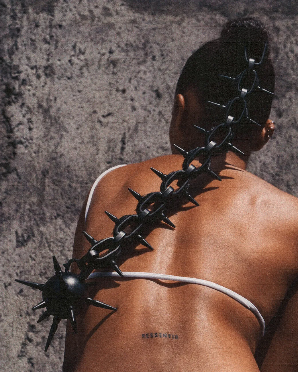Hair accessory fusing organic braided hair with the rigidity of the medieval ‘Flail’ weapon.