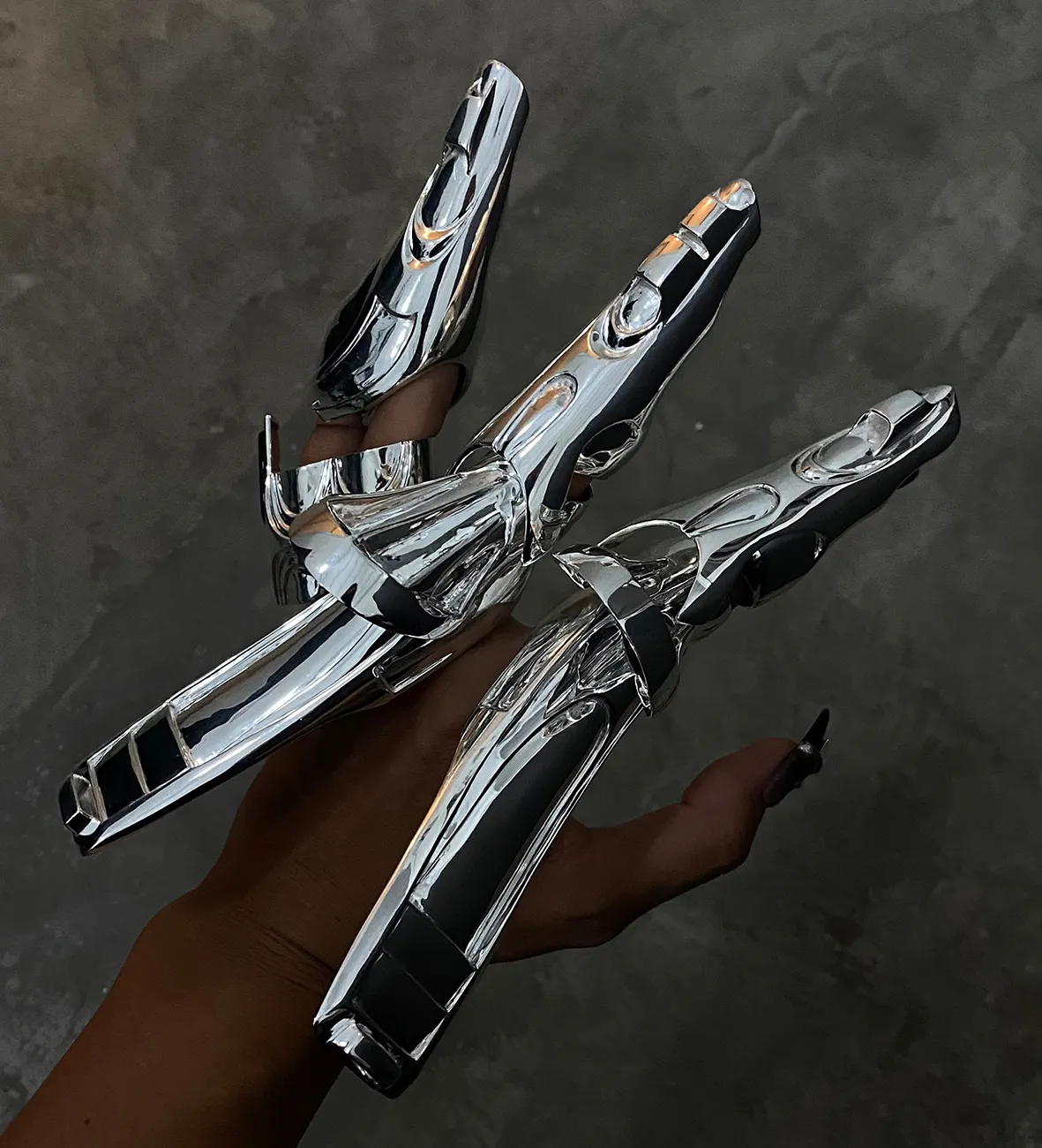 A series of three speculative tools/adornments for the hand, made from silver and brass.